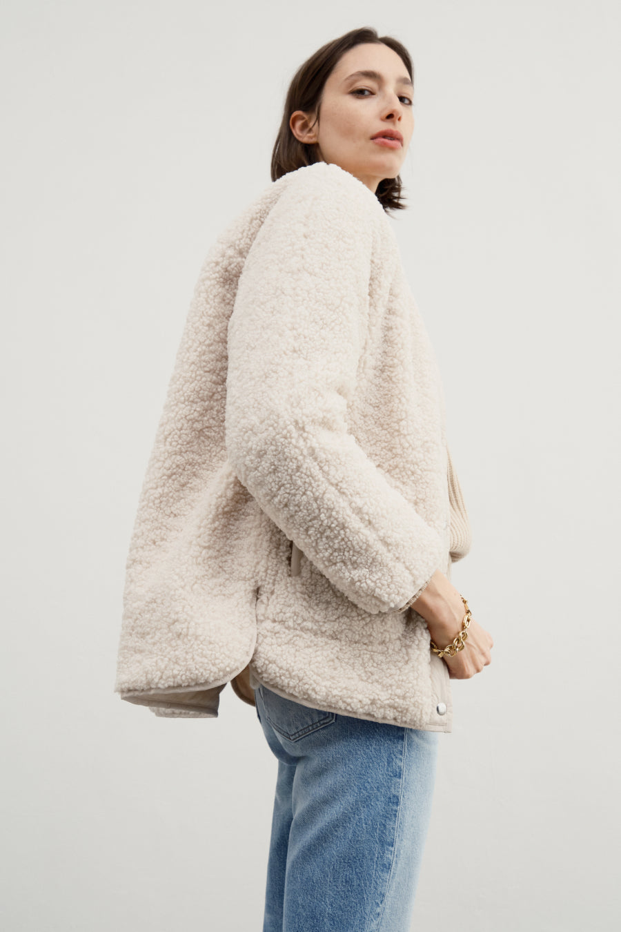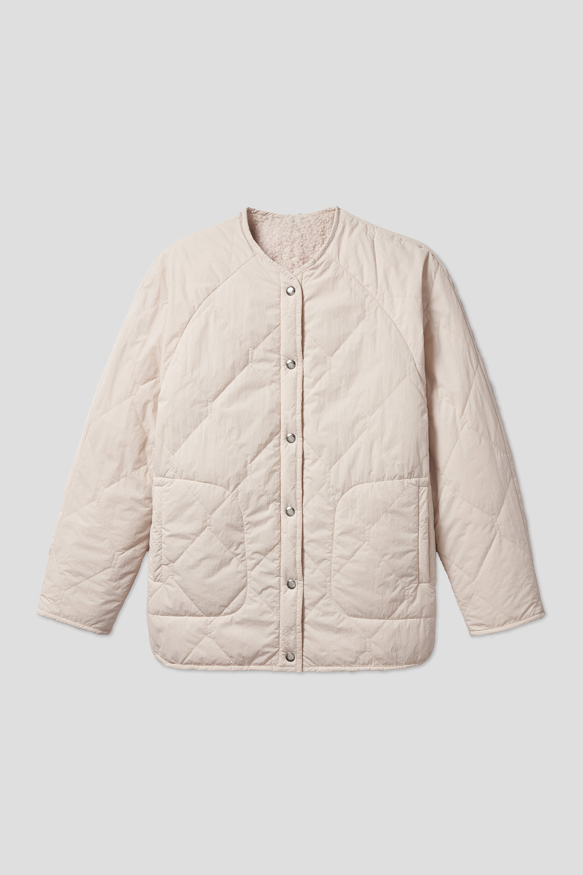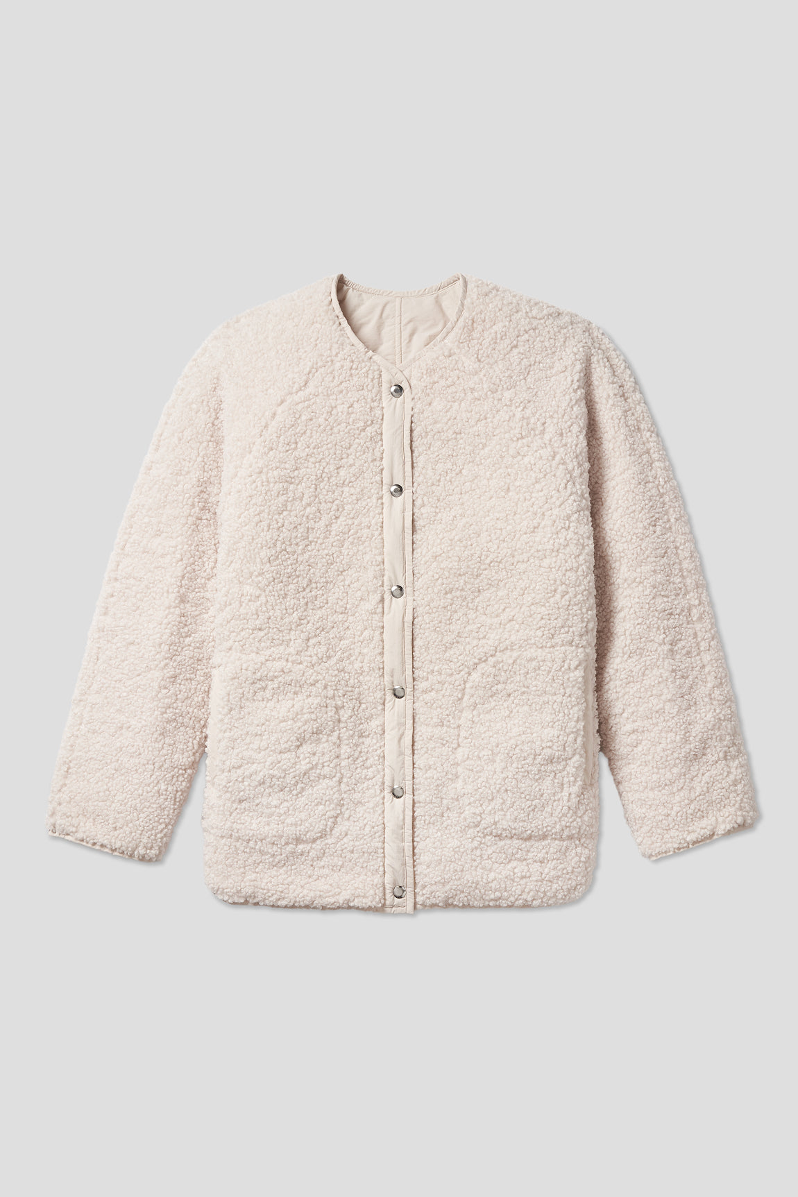 This is one of those pieces that, once you own it, will make you forget how you ever lived without it. A reversible fleece car coat with a chic collarless neckline. Snap closures, batted quilting, pockets on both sides.?