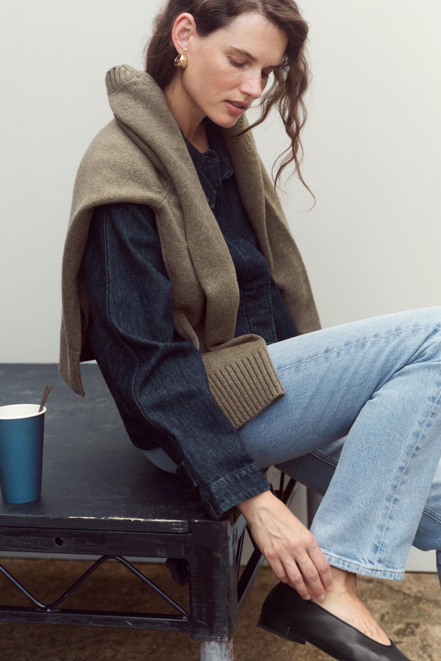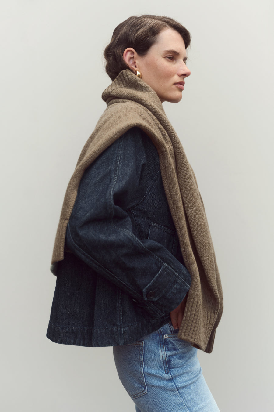 Chic little cropped swing jacket made from Italian indigo-dyed cotton. Wide welt pockets. Beautiful dark faux horn buttons. Adjustable tabs on the sleeve and a collar tab at the neck. All about the details.