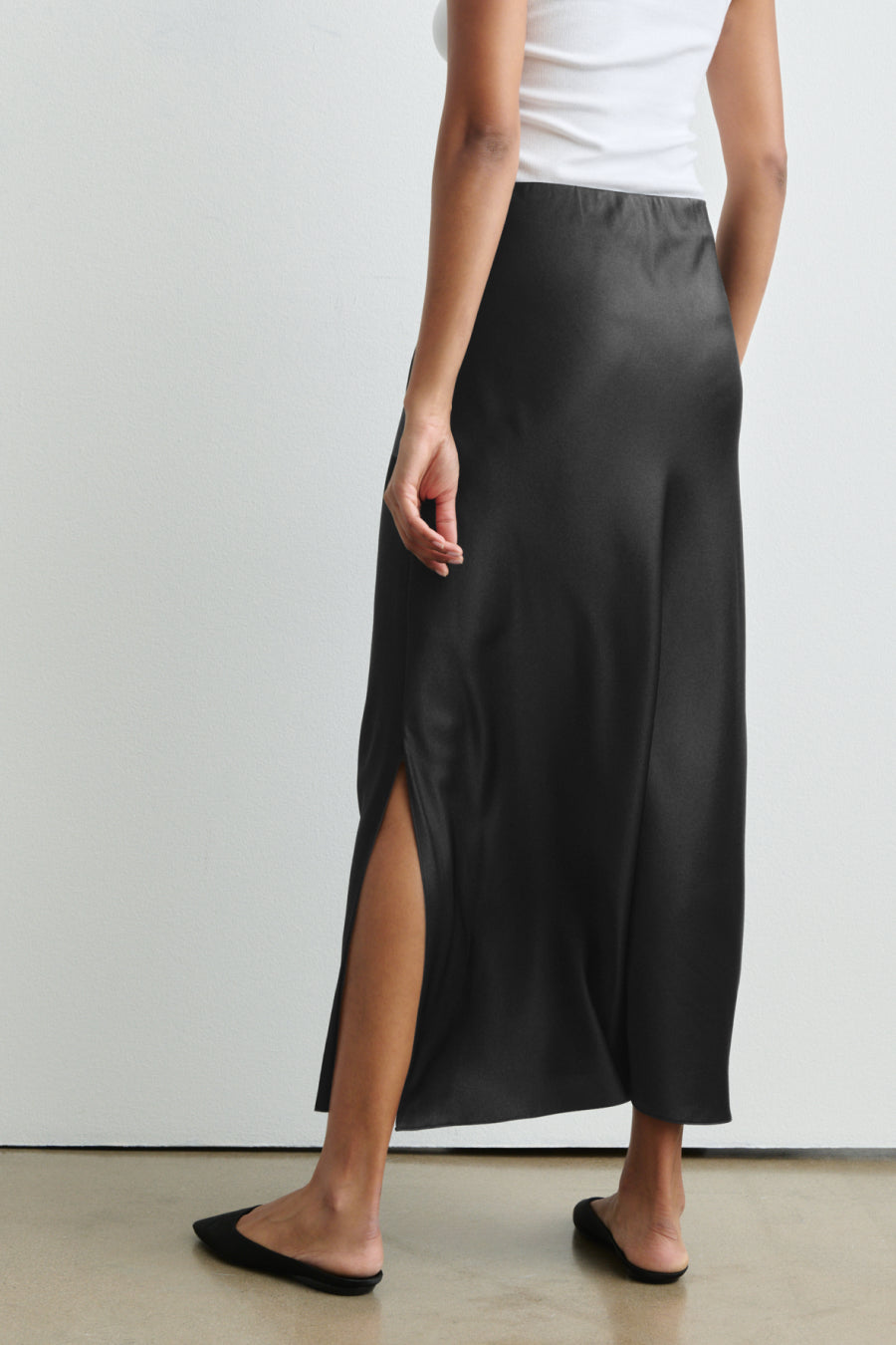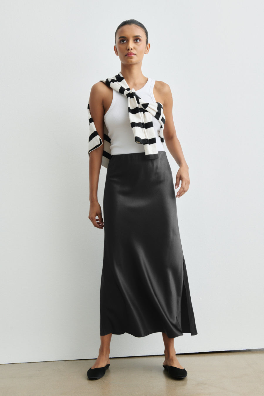 One of your most luxurious closet staples. A superior silk charmeuse skirt that glides over curves and pairs with every single top you own. Works with every shoe, too. Magic.