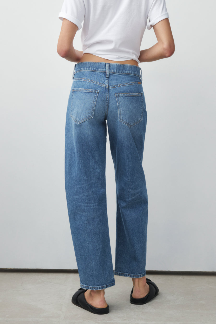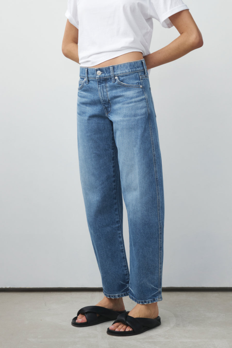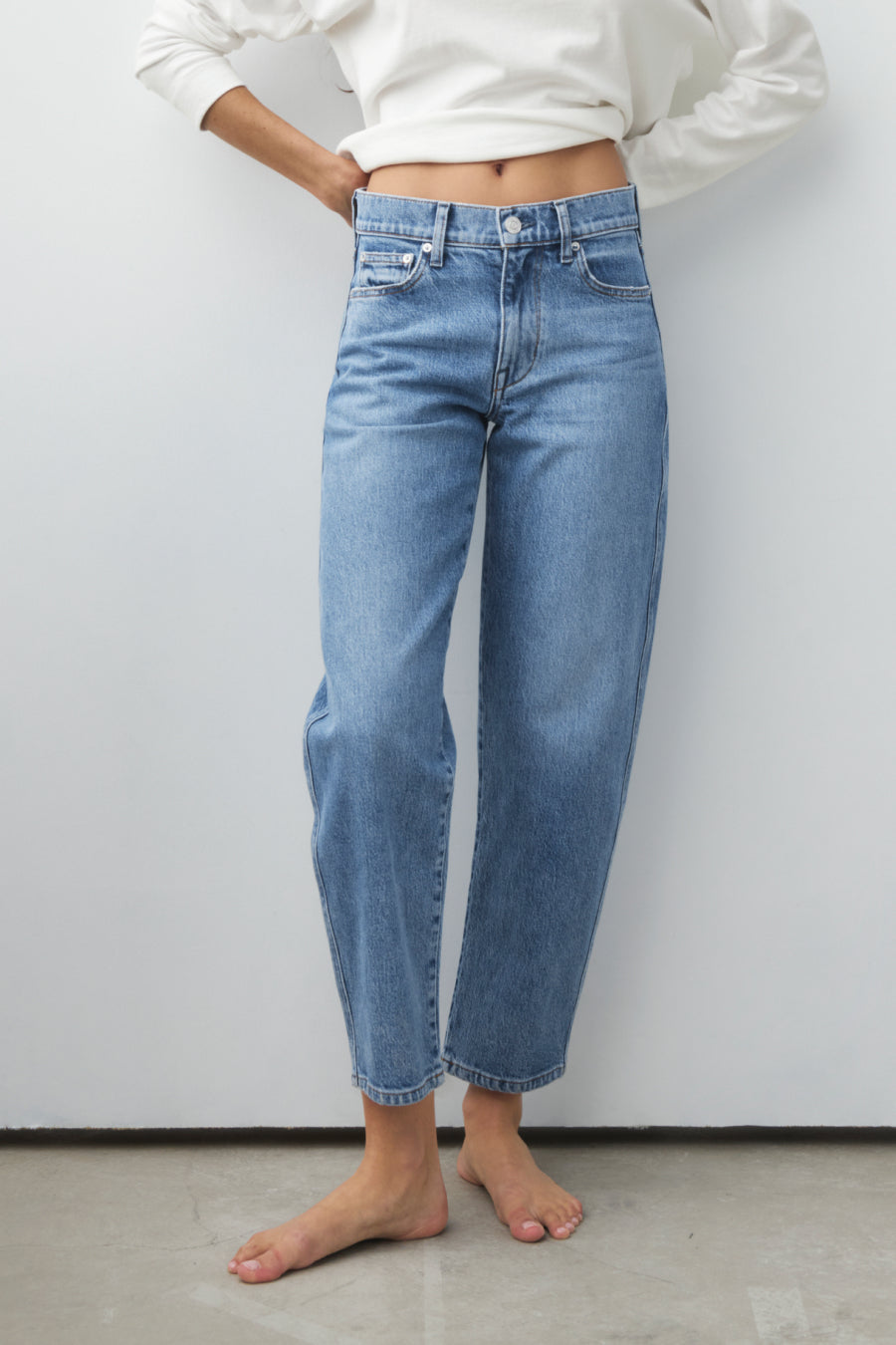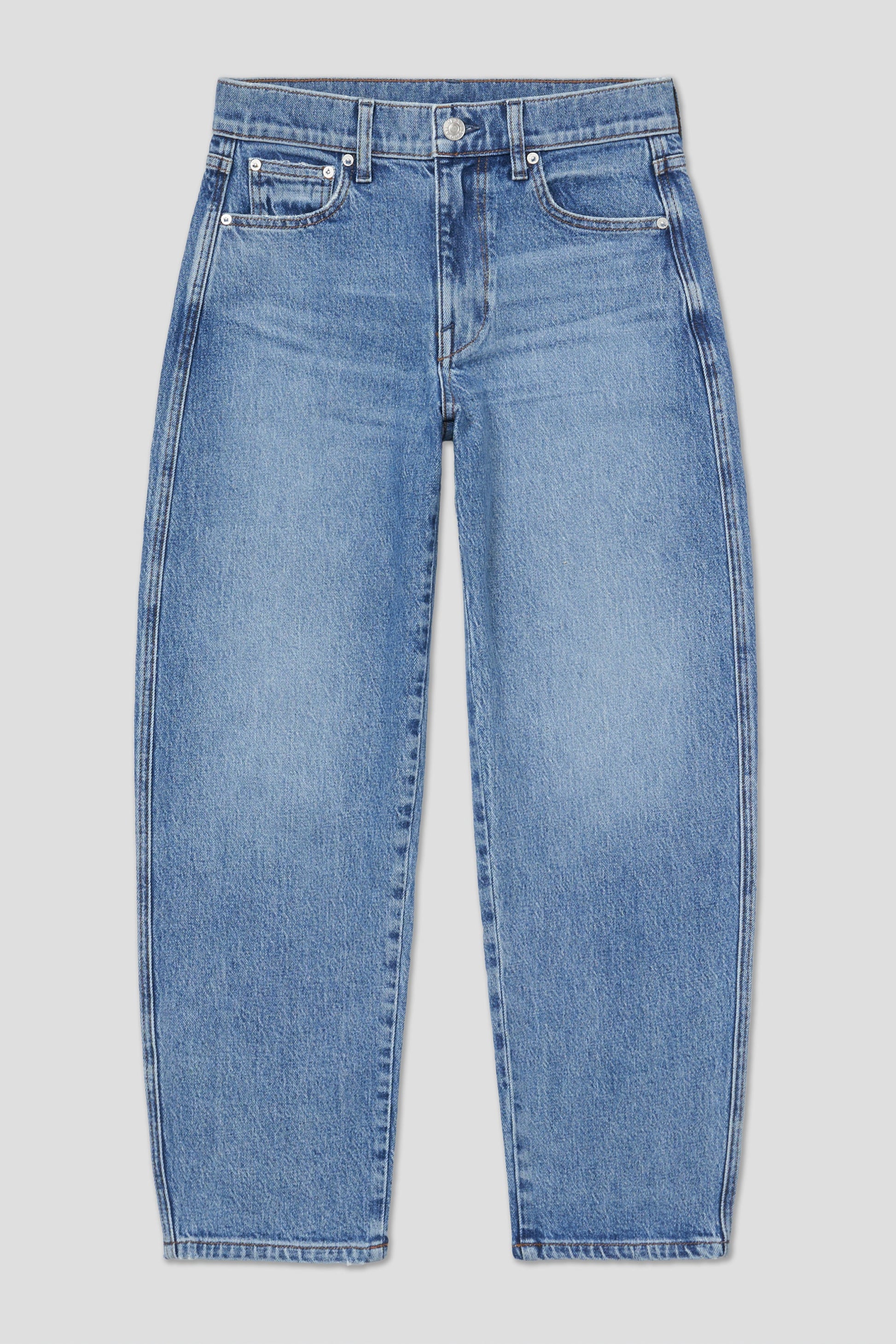 You will live in this pair. Anchors at the waist, then bows out into a laidback barrel leg. Superior denim. Made in L.A.