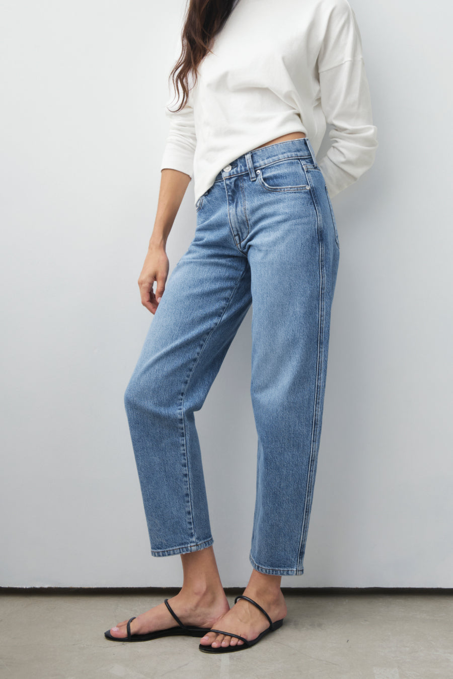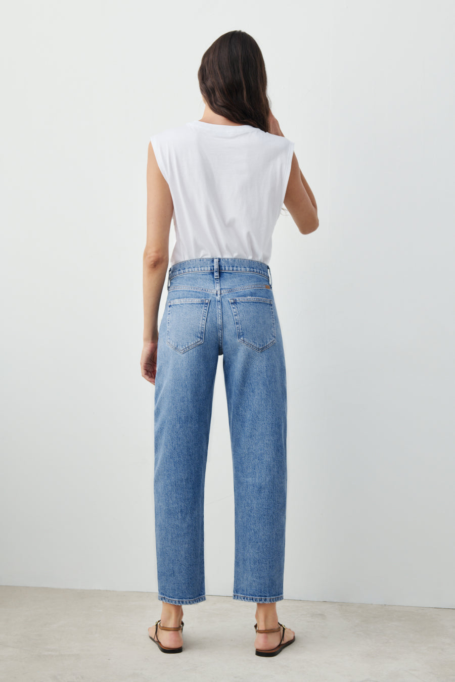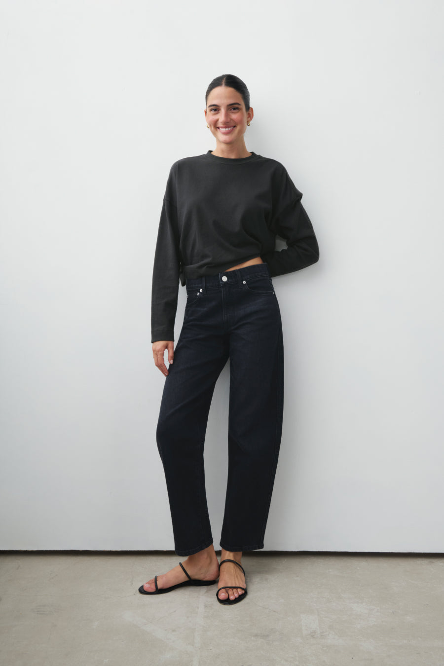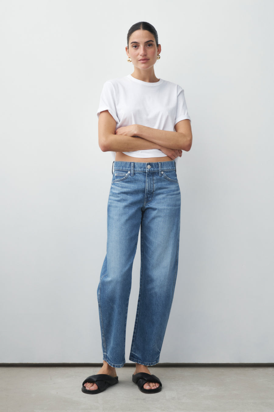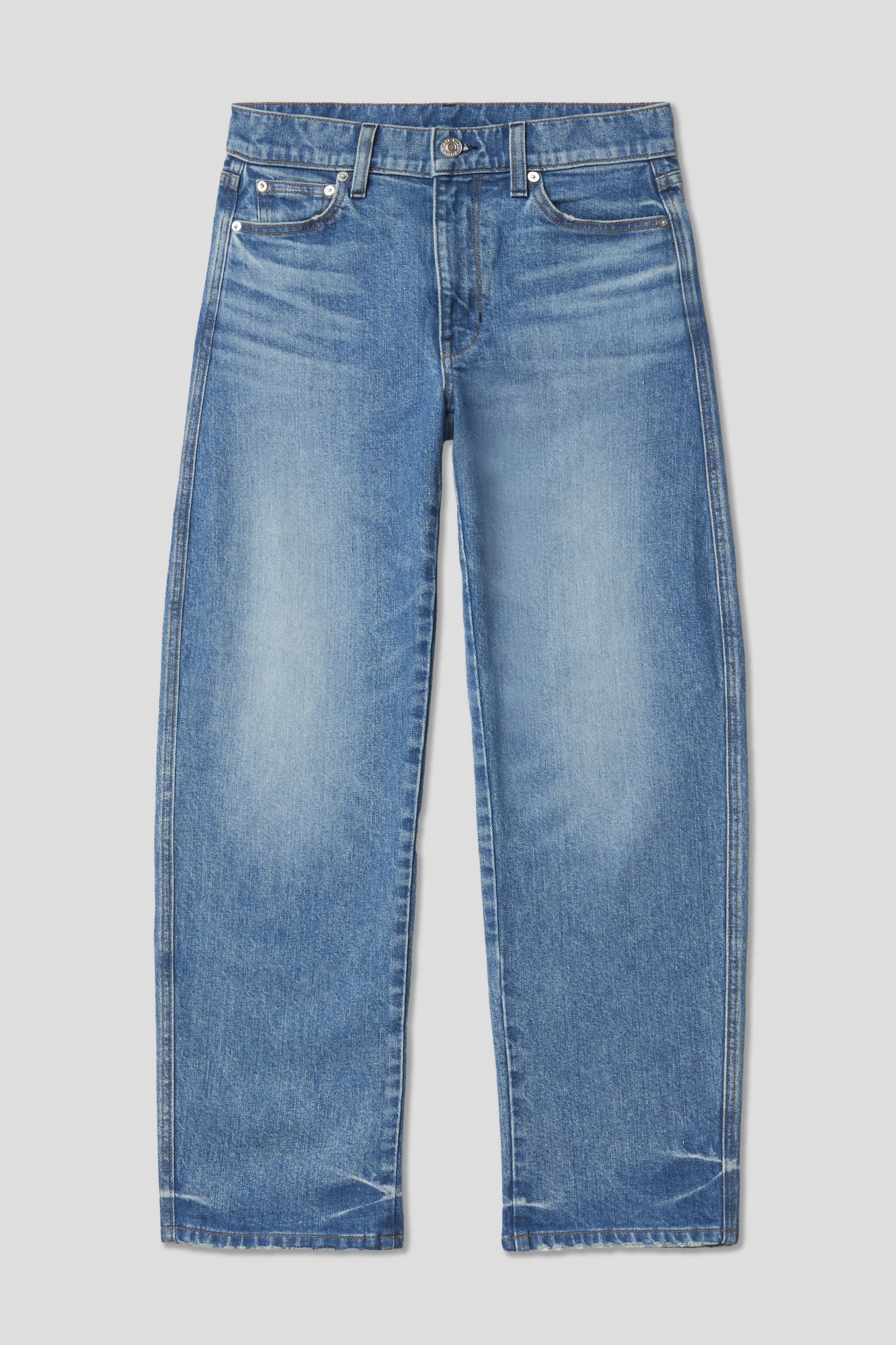 You will live in this pair. Anchors at the waist, then bows out into a laidback barrel leg. Superior denim. Made in L.A.