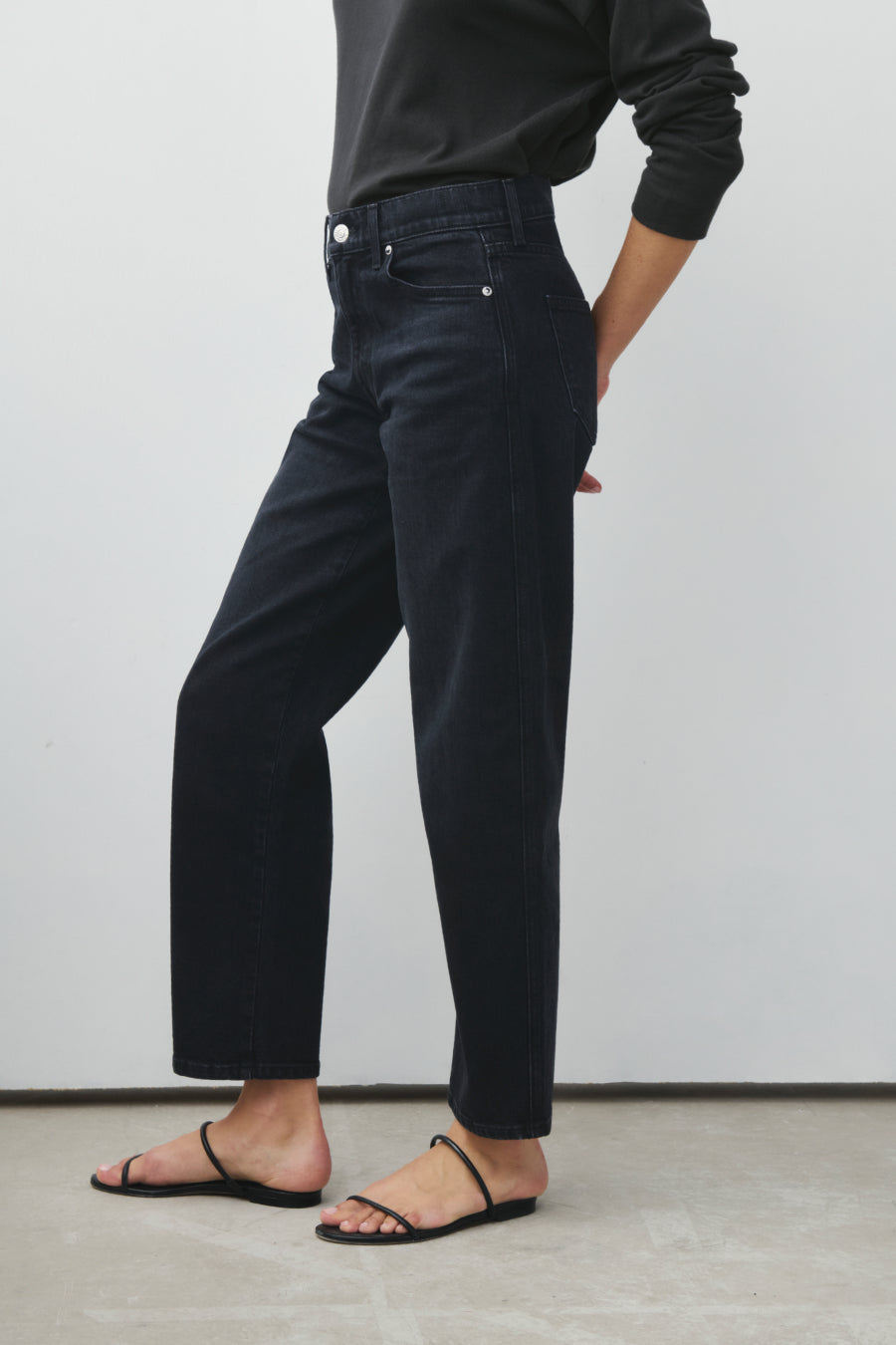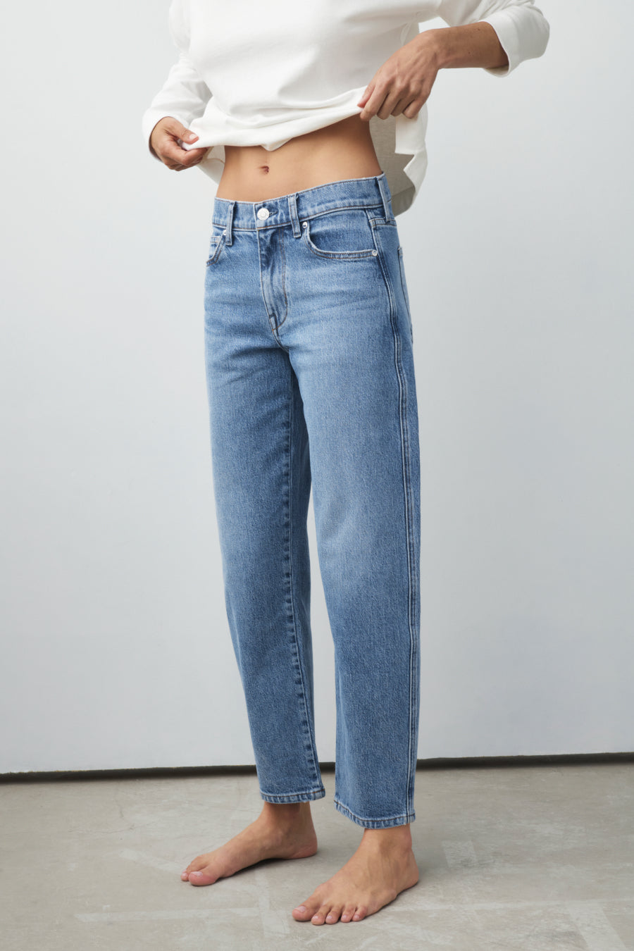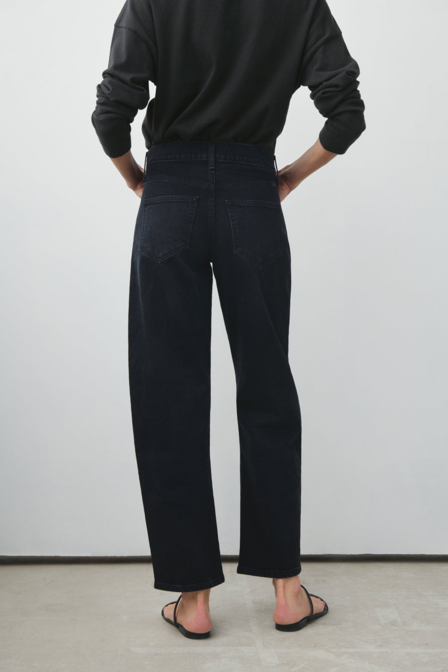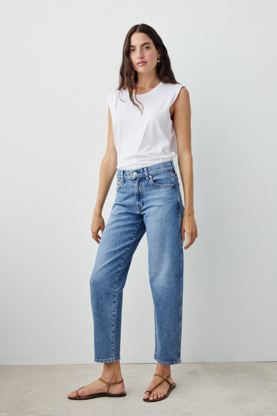 You will live in this pair. Anchors at the waist, then bows out into a laidback barrel leg. Superior denim. Made in L.A.
