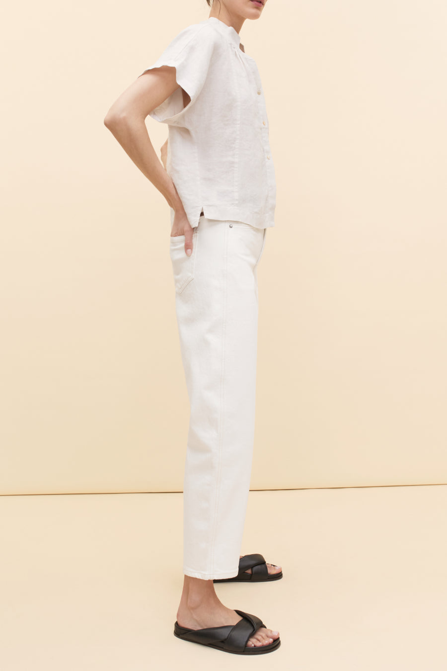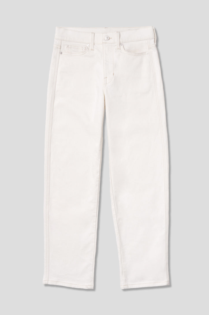 Creme Soda: Off-white, opaque, heavyweight structured denim with comfort stretch.