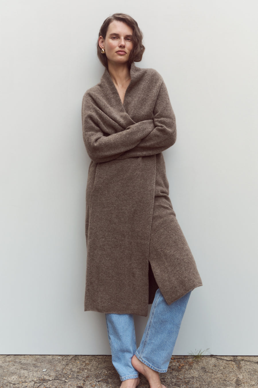 Air-light, exceptionally warm, sumptuous Italian merino & yak yarn. Like wearing a long, luxurious blanket. So soft, so effortlessly chic, you'll never take it off. Double layered neckline for maximum warmth. Side seam pockets. Full length. Actual heaven.