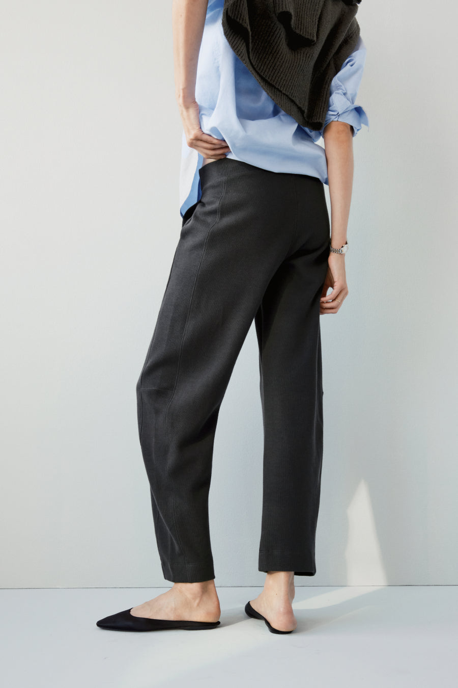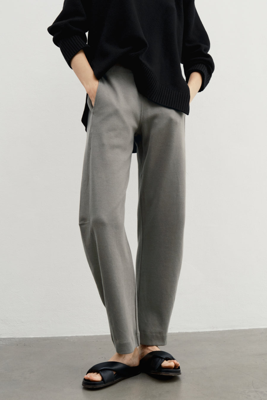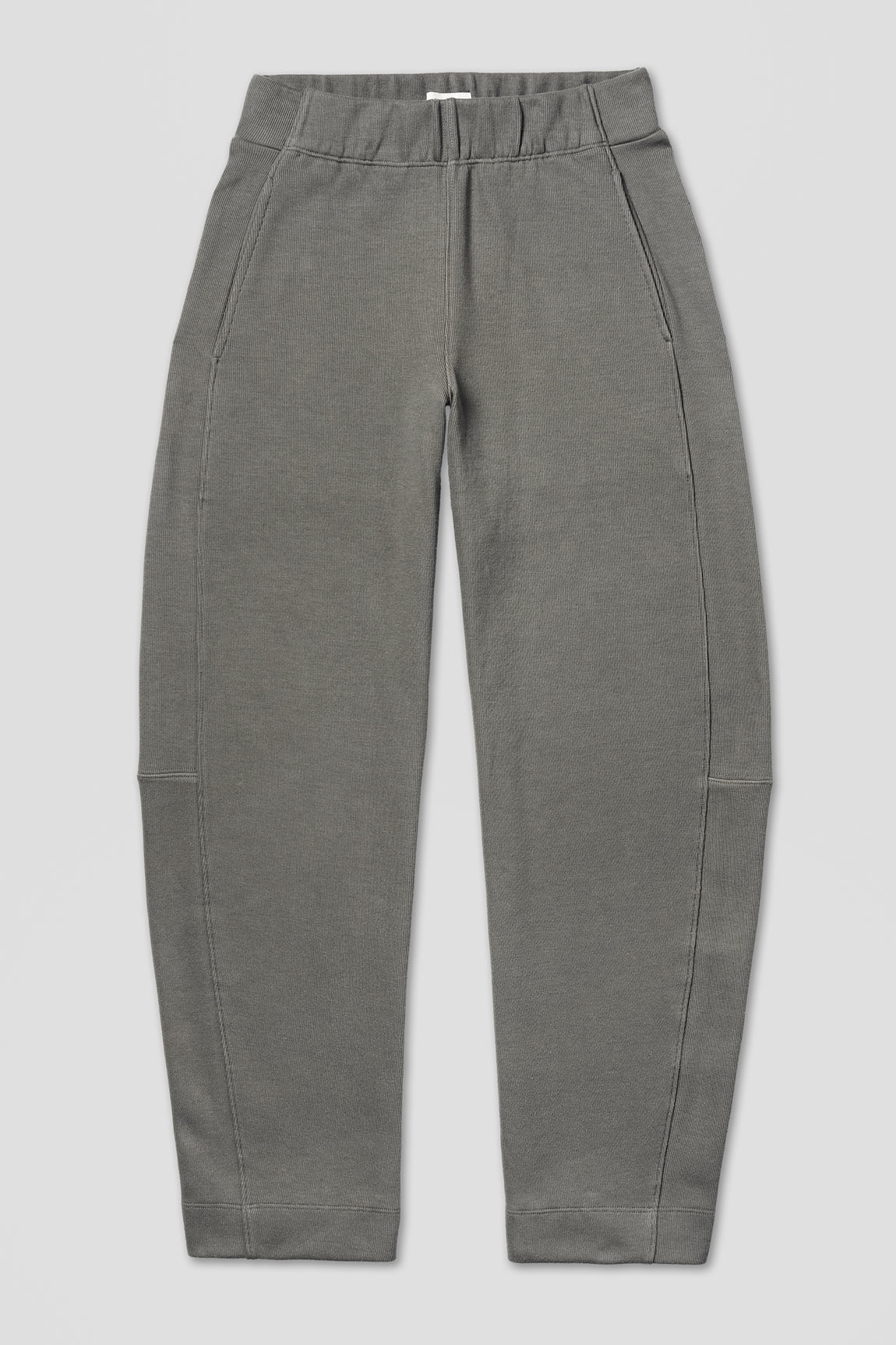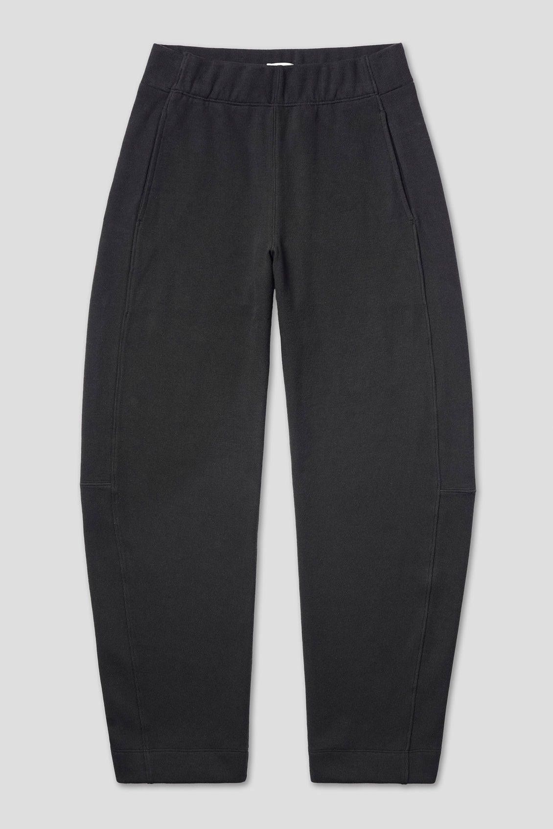 A laidback pair of pull-on pants in a soft, sturdy 100% pima cotton brushed rib knit. Easy barrel leg with a flattering waistband construction that keeps the front body clean. (Hidden elastic on the back and sides.) Cozy jersey pockets, because, hello, obviously. You'll never take them off.
